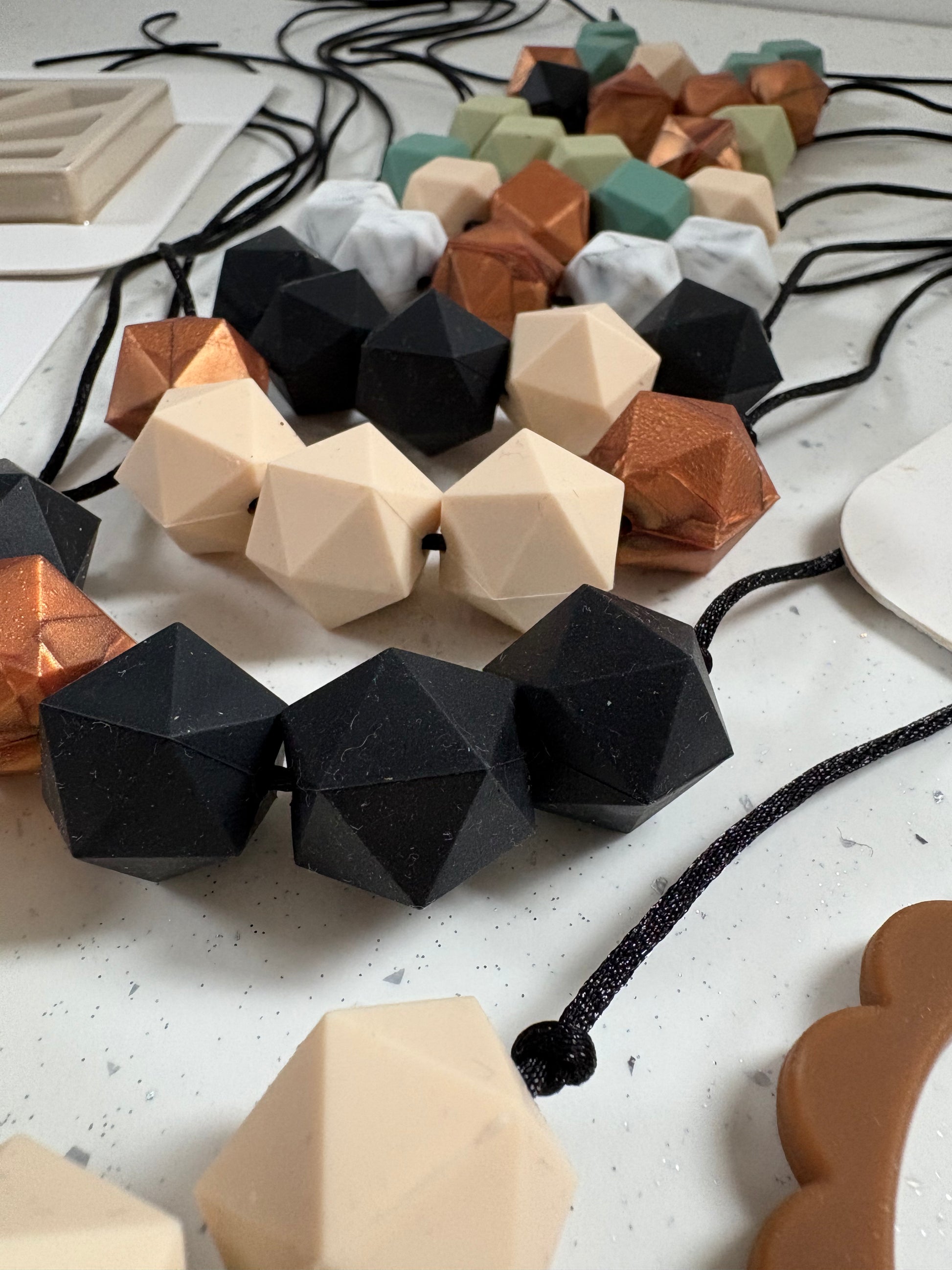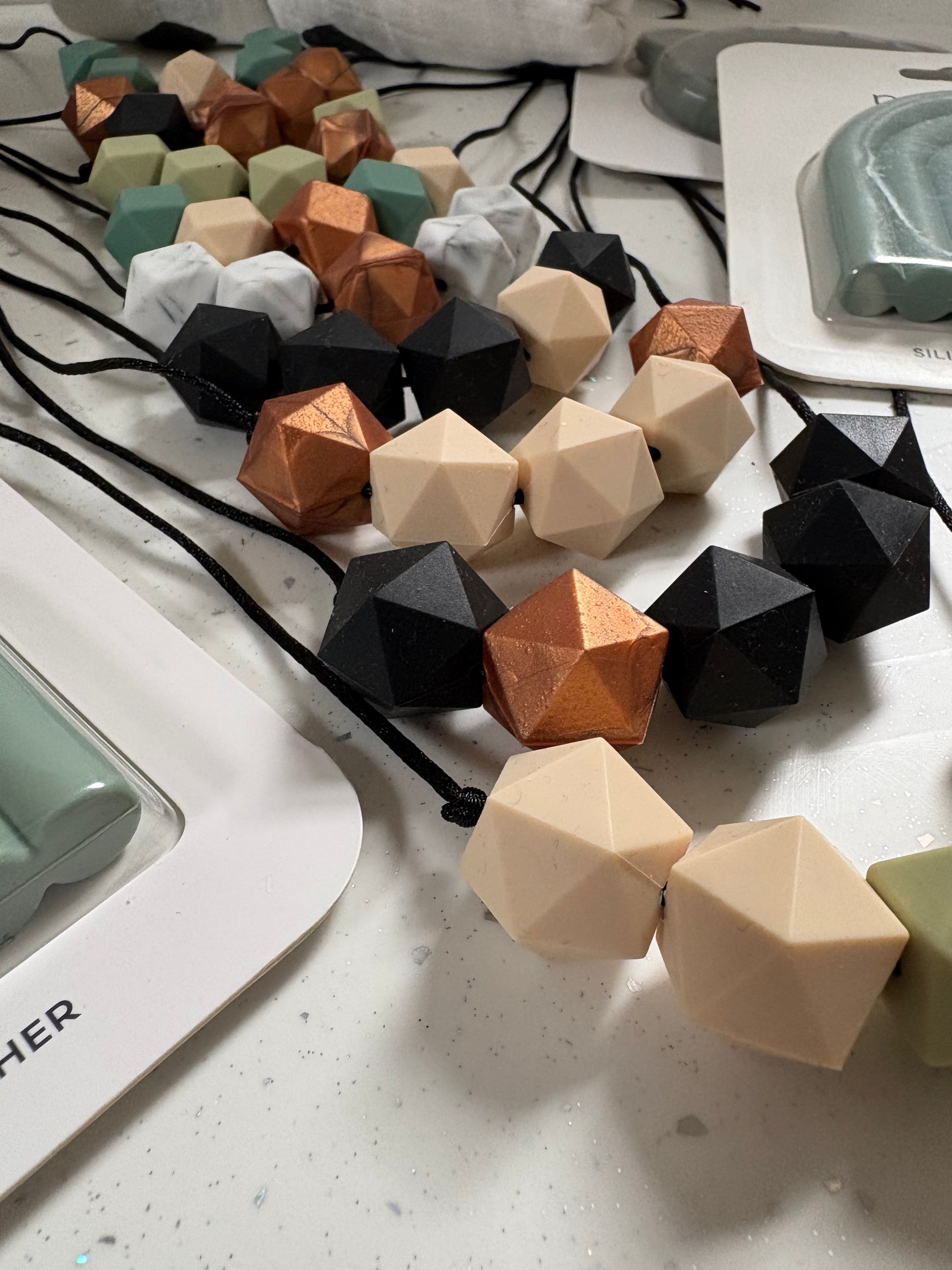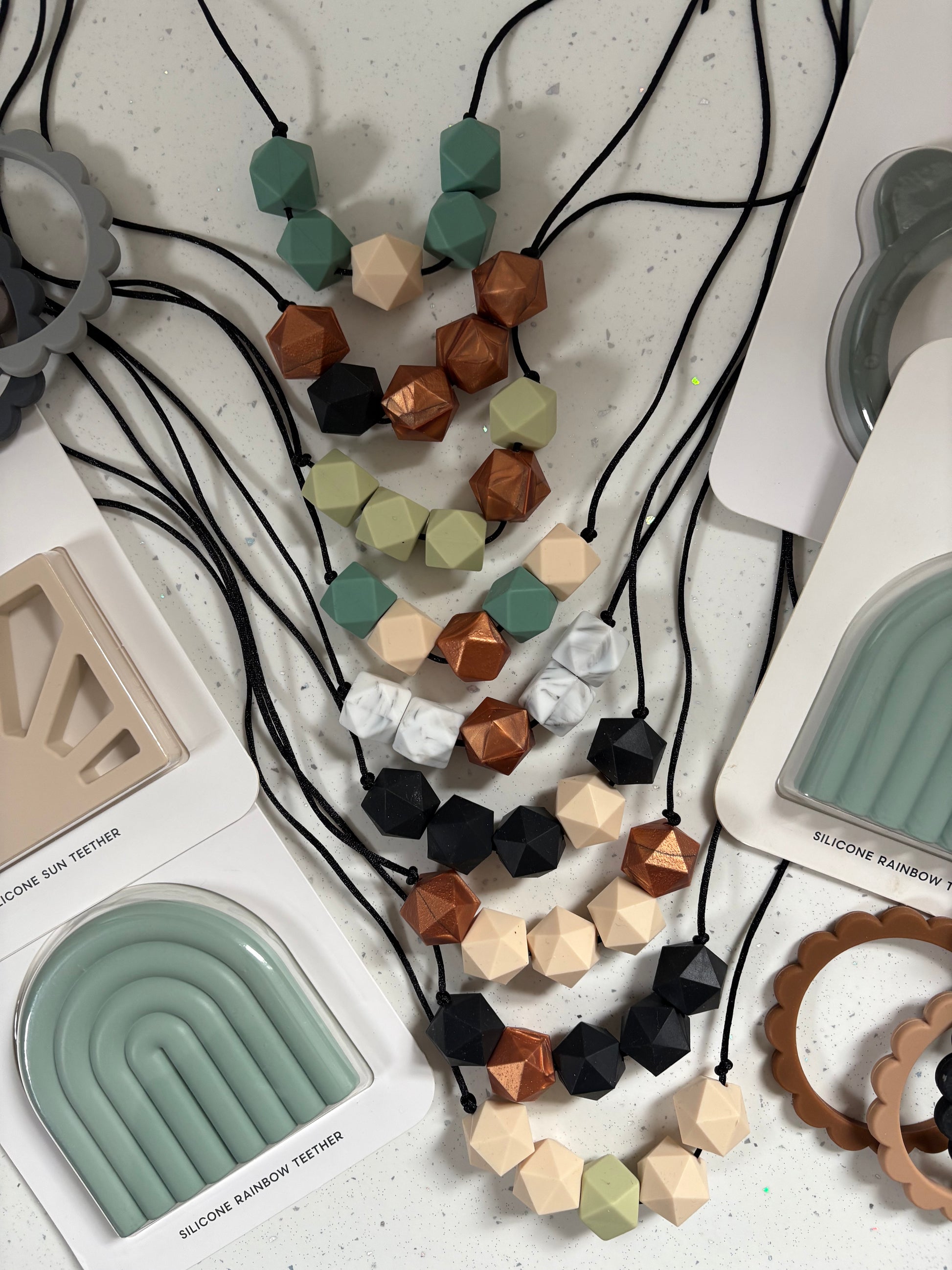 Necklaces designed to be safe for your little one to play with and chew on when they are teething hard. Safe for little hands but also stylish too. Can help reduce nipping, scratching & hair pulling while snuggled up together making cuddling or feeding your little one easier.
